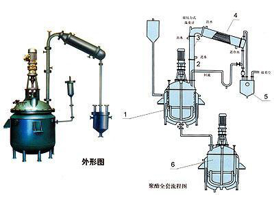 本全套裝置是用于生產不飽和聚酯樹脂、酚醛樹脂、環氧樹脂、ABS樹脂、油漆的設備。全套設備由反應鍋、豎式分餾柱、臥式冷凝器、貯水器、溢油槽、管線(對稀釜)等組成,全套設備與物料接觸部分采用不銹鋼制作。